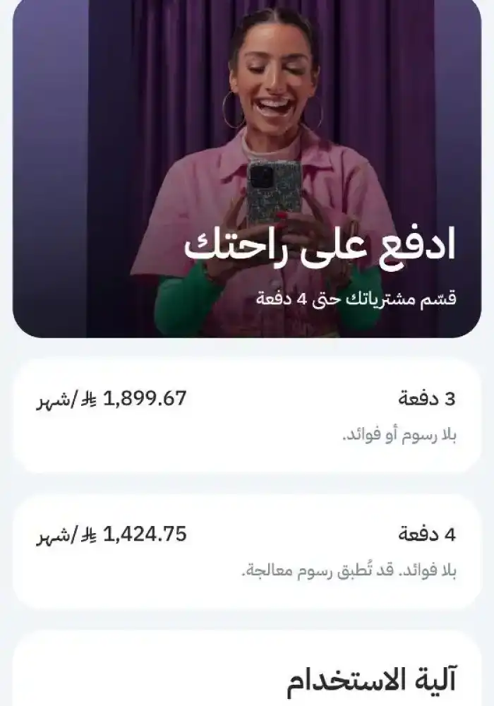 تتيح لك تابي شراء المنتجات والخدمات الآن، وتقسيط قيمة المشتريات على عدة دفعات بدون فوائد أو رسوم إضافية.